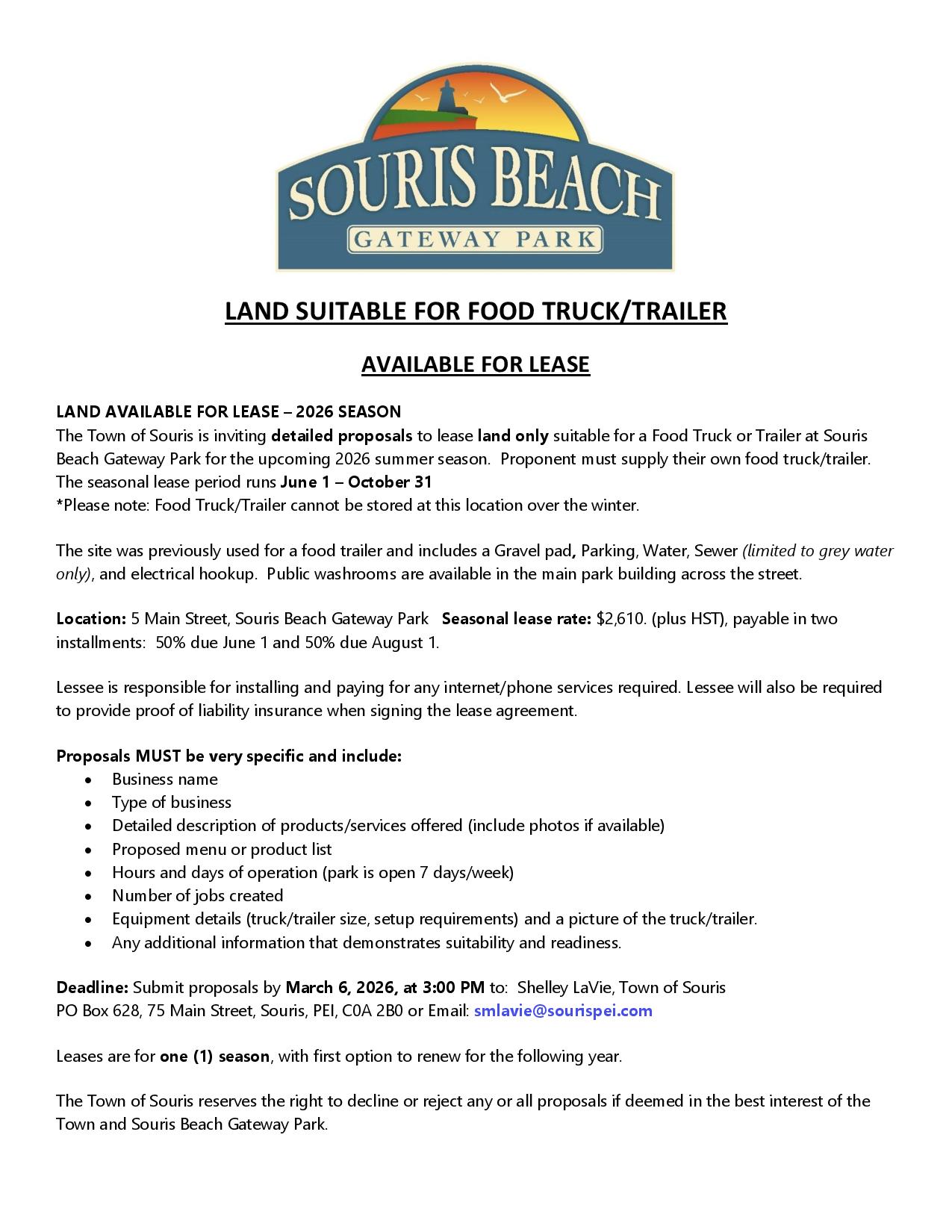 The Town of Souris is seeking proposals to lease land suitable for a Food Truck/Trailer located at the Souris Beach Gateway Park for the upcoming 2026 summer season. The seasonal lease operating period runs from June 1 to October 31. Details are attached.